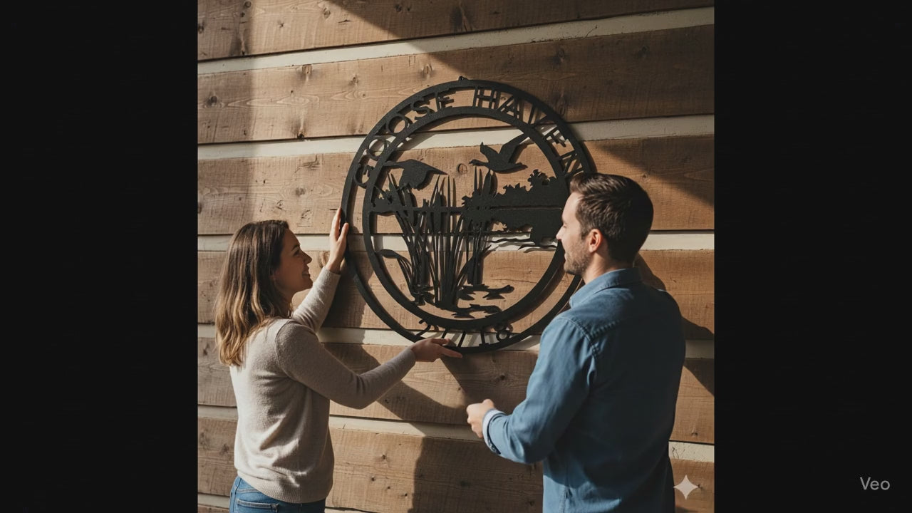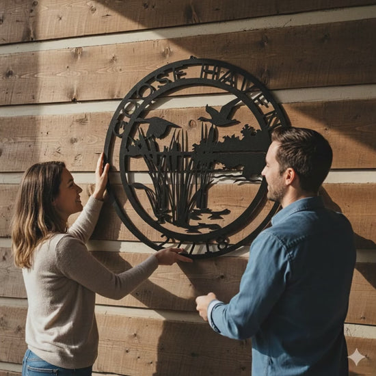 Bring the serenity of nature to your home or cabin with this Goose Haven custom metal sign. Featuring flying geese, cattails, and a lake scene, it’s the perfect wall art for outdoor lovers. Add your family name, property title, or date to make it truly unique.