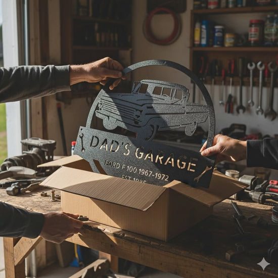 This personalized metal sign showcases the legendary 1967–1972 Ford F-100 – one of the most iconic classic trucks ever built. Perfect for garages, workshops, man caves, or as a unique gift for Dad, Grandpa, or any Ford lover.